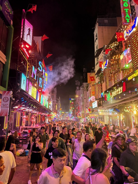 After dinner we took a short taxi ride to what I have affectionately nicknamed Vietnam Vegas. A street pulsing with nightlife: bars, restaurants, music, go-go dancers, panhandlers, seedy hotels, pimps and prostitutes. After walking along the strip, we settled down at some outside seating of a bar to have a drink and people watch. Jet lag began to set in and we hopped in some taxis and headed back to the hotel for another night’s rest.