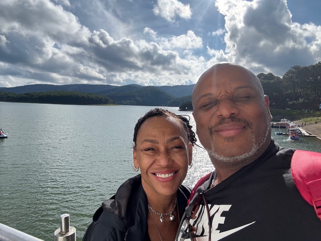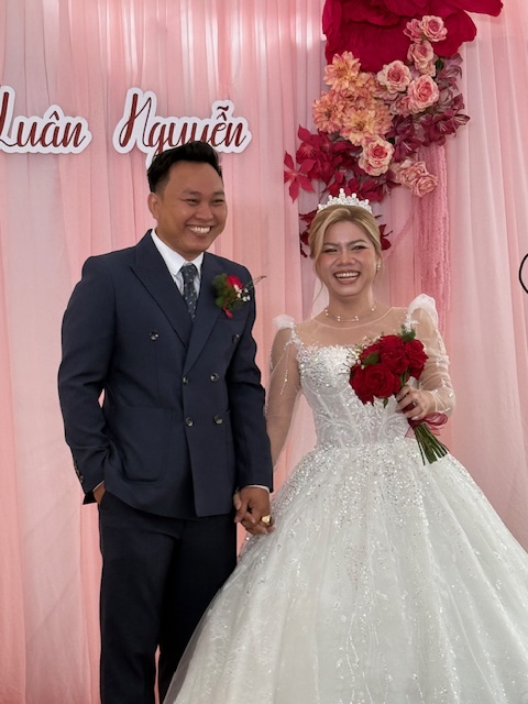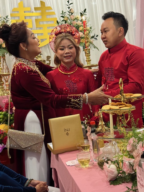 Stephen and I were taken back to Cherry’s mom’s house where we participated in a blessing ceremony of the bride and groom. We were seated with her elder married couples representing her American elder family. The ritual consisted of the bride and groom kneeling before each couple sharing glasses of wine and the elder couples offering their blessings and a toast to the couple. It was an honor I was not expecting. As Cherry and Luan knelt before us, sharing wine and receiving our blessings, I felt the weight of tradition and the warmth of inclusion. We weren’t just guests – we were family.