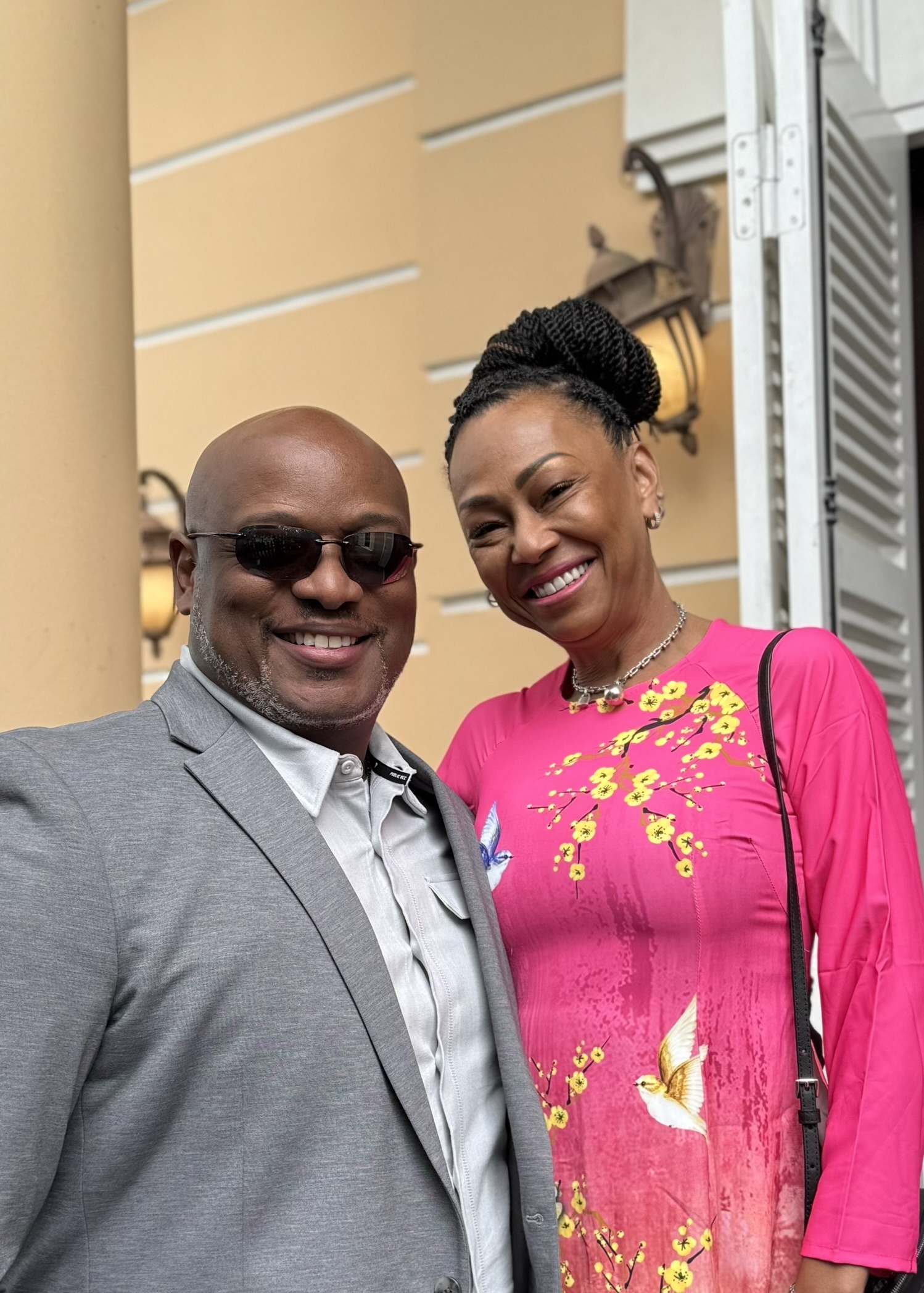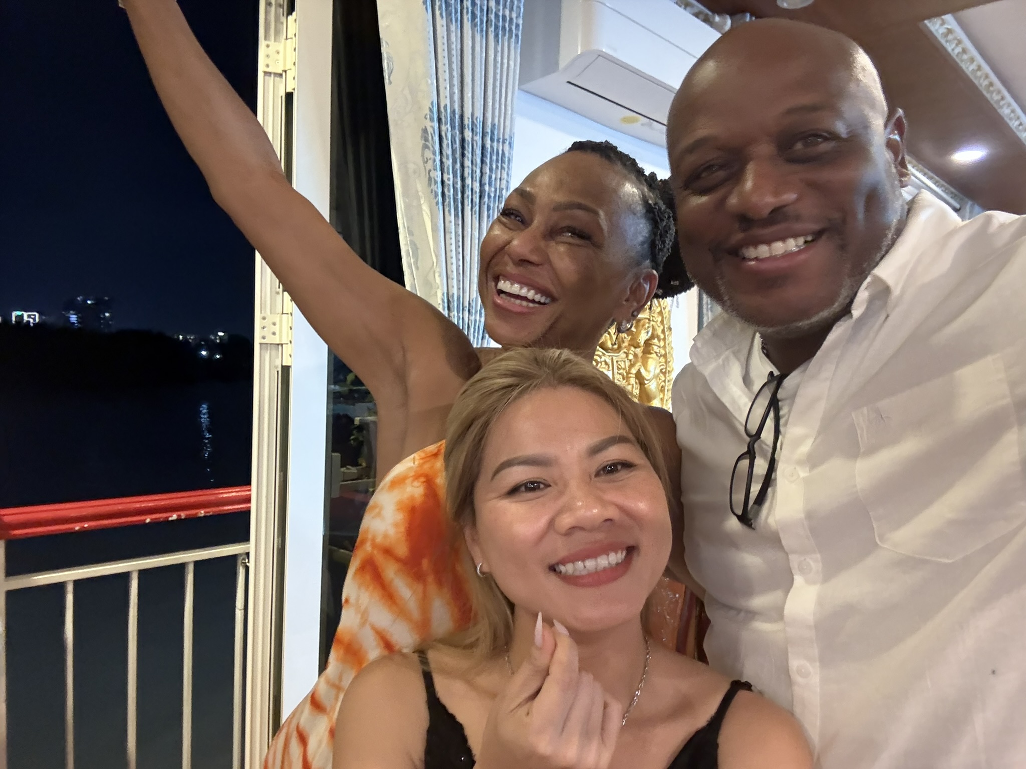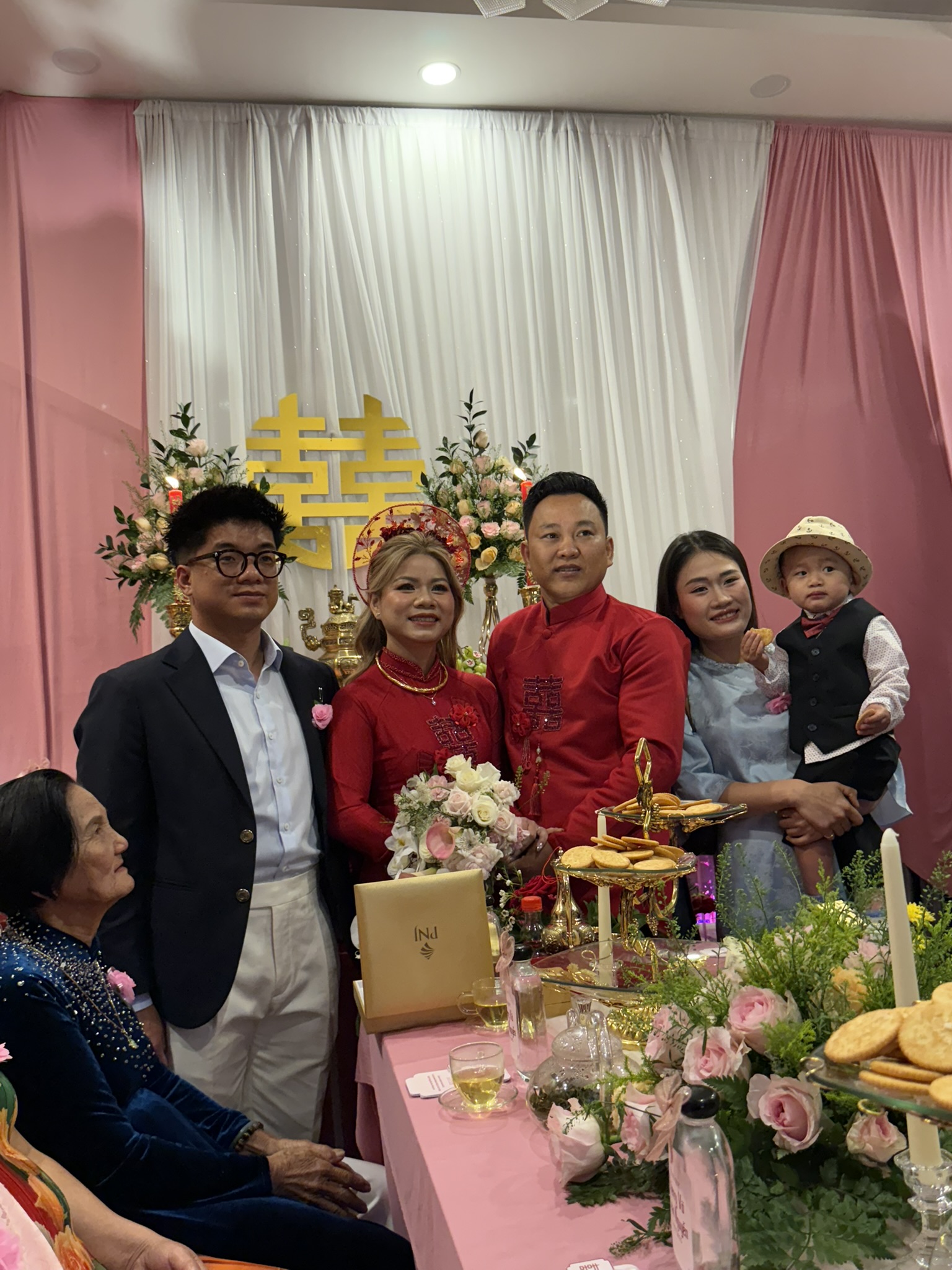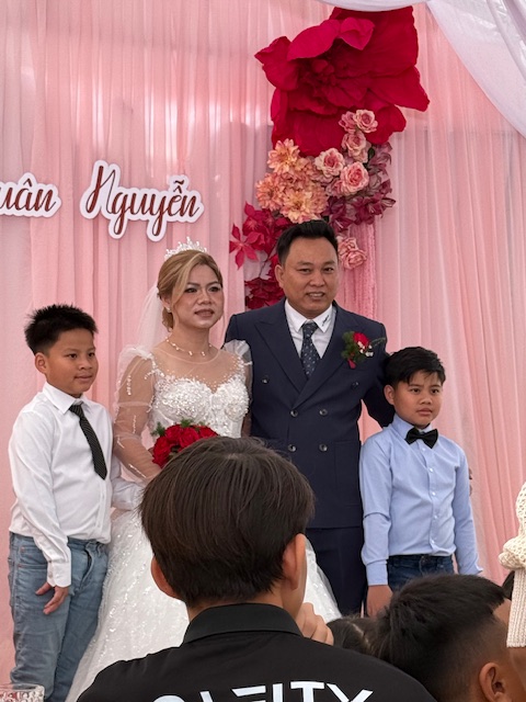 Stephen and I were taken back to Cherry’s mom’s house where we participated in a blessing ceremony of the bride and groom. We were seated with her elder married couples representing her American elder family. The ritual consisted of the bride and groom kneeling before each couple sharing glasses of wine and the elder couples offering their blessings and a toast to the couple. It was an honor I was not expecting. As Cherry and Luan knelt before us, sharing wine and receiving our blessings, I felt the weight of tradition and the warmth of inclusion. We weren’t just guests – we were family.