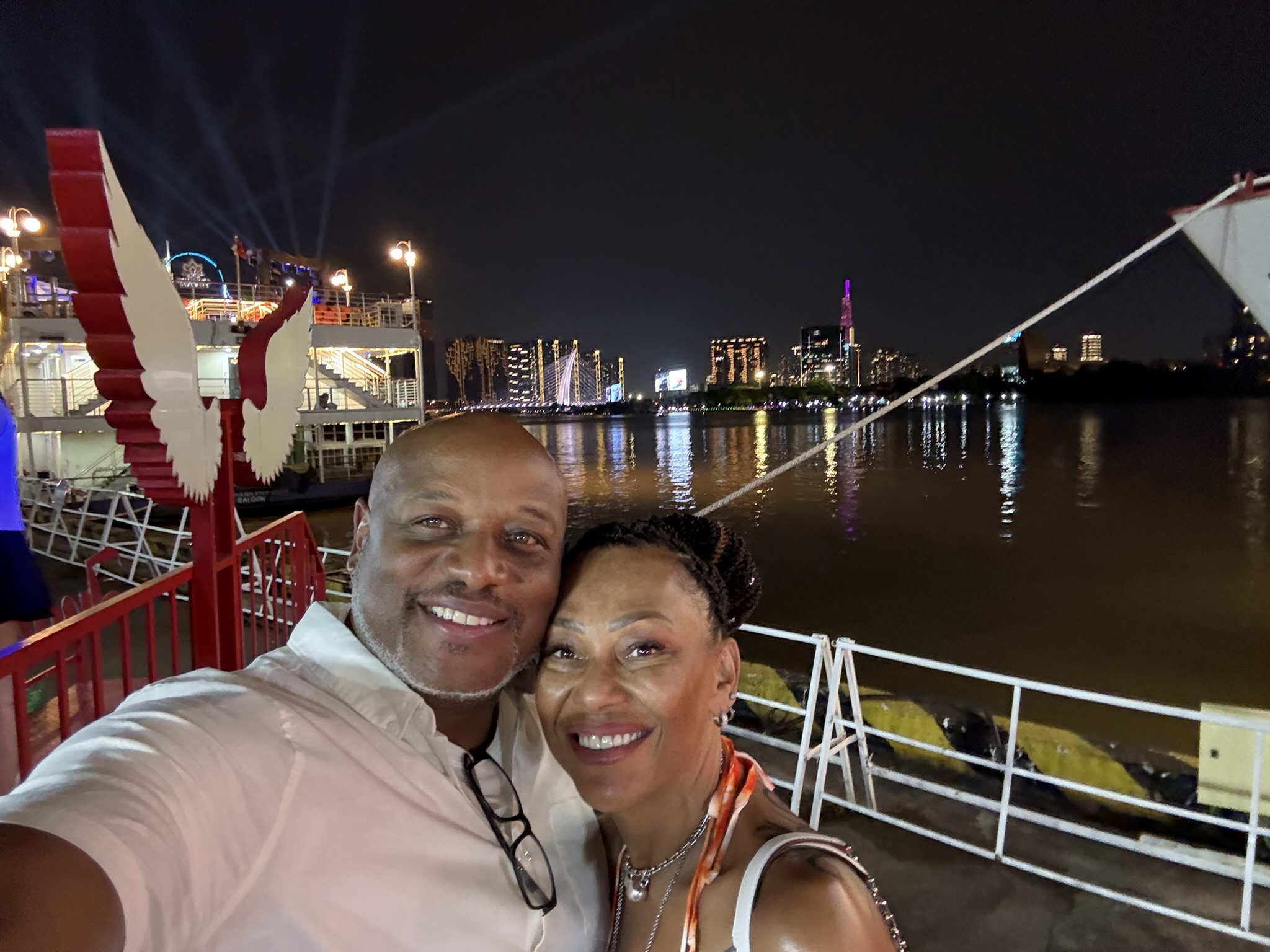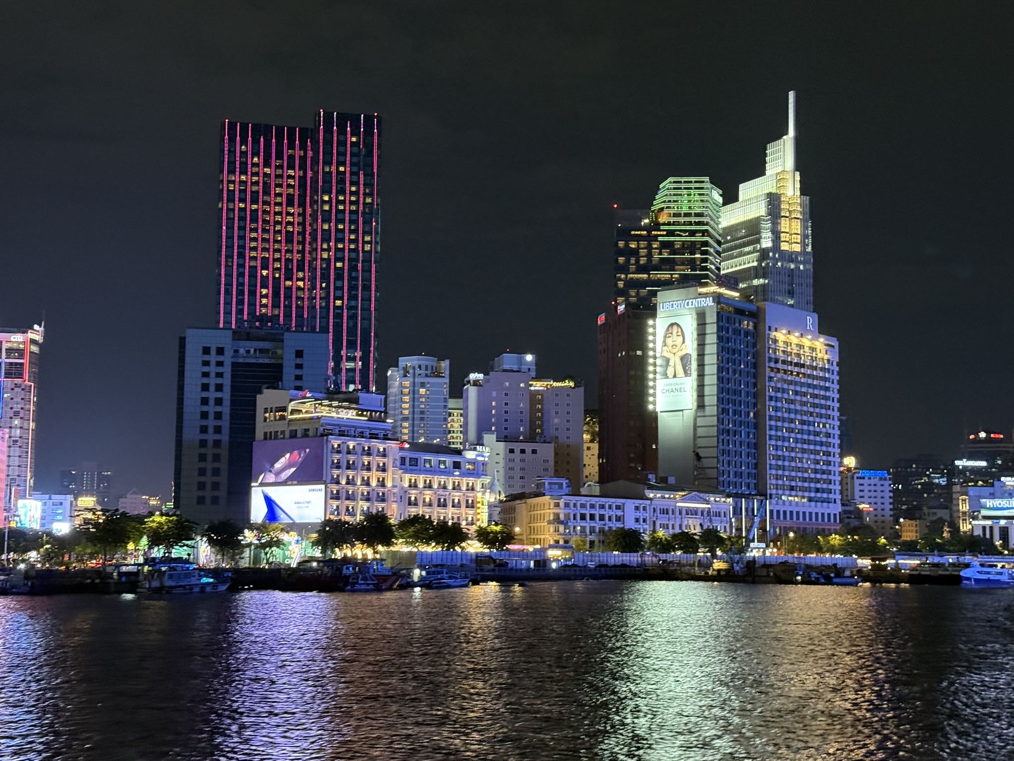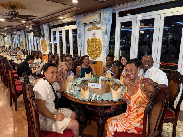 Before dinner, Cherry arranged for her aunt the masseuse to give Stephen and me massages in our room. She had her other cousin do lashes on some of the women in our American travel party in their room. Later that evening we headed out on a dinner cruise along the river. The buffet was a wide variety of traditional Vietnamese food. We laughed, talked and drank the night away while enjoying a scenic tour of the city from the boat. The city is quite impressive with skyscrapers, lights and a bustling atmosphere. I likened it to Vietnam’s New York City.