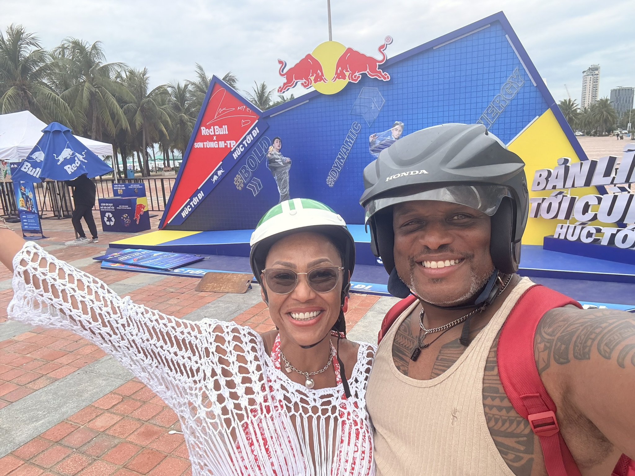 At breakfast we surprised Mina with a birthday cake and champagne. After breakfast we rented scooters and did a quick tour into the mountains and then back to the beach where Stephen, Ryan and Mina parasailed. I had a “Uber” scooter driver because I was nervous about how Stephen would do with the scooter and car traffic. Once I saw he was comfortable I ditched my driver and hopped on the back of his scooter. On the way back to the hotel we spotted a Red Bull event being set up. I couldn’t resist stopping for pics with an F1 team backdrop.